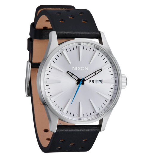 Nixon Sentry Leather Watch Chrome/Silver Sunray/Black
